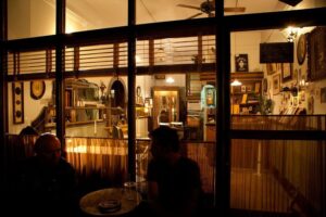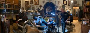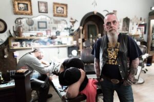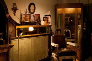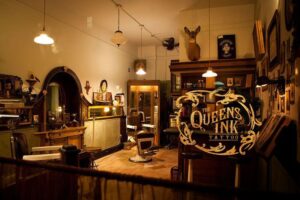 The Queens Ink was in 2012 (when it was open), Astoria’s newest tattoo parlor, but its oldfashioned décor and bohemian aesthetic places it in a category of its own. The vintage-clad shop shows more resemblance to an antique store or museum of ancestral relics than to a typical tattoo parlor. Oddities from a bygone era line the walls and ornament the crowded yet ample space. Sepia pictures that could have been discovered in a Civil-War era photo album depict men with the sort of horseshoe mustaches and Lincolnesque beards that are making a steady comeback. Skulls gaze off into the distance, wooden ships remain docked on shelves, and a large deer head oversees operations from above.